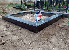 Когда подготовительные работы на территории могилы были завершены, мы принялись за укладку брусчатки на пескобетон, сама плитка была уложена вровень с облицованным гранитными плитами цоколем. Параллельно с этим мы подготовили основание для последующей установки надгробья.