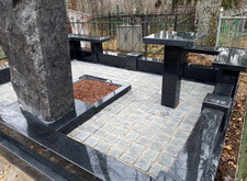 Далее мы приклеиваем лавочки и столешницу, в цветник засыпаем мульчу. Когда все работы на участке завершены – замываем брусчатку, тем самым смывая осевшую на памятнике и оградке бетонную пыль.
